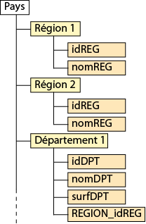Ainsi « PAYS » pourra contenir de 1 à n « REGION » et de 1 à n « DEPARTEMENT ».