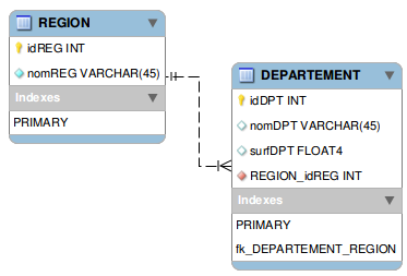 - Clés étrangères (relations parents-enfants) : « REGION_idREG » est une clé étrangère de « idREG ». La relation est de type 1-n;