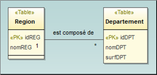 Nous avons donc 2 tables « REGION » et « DEPARTEMENT ». Nous souhaitons les modéliser en GML en conservant leurs caractéristiques :