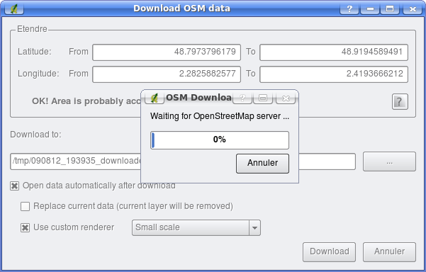 La 3eme icône en parant de la gauche (flèche bleu vers le bas) permet de récupérer les données à partir du serveur OSM. La fenêtre de récupération des données ressemble à ceci :