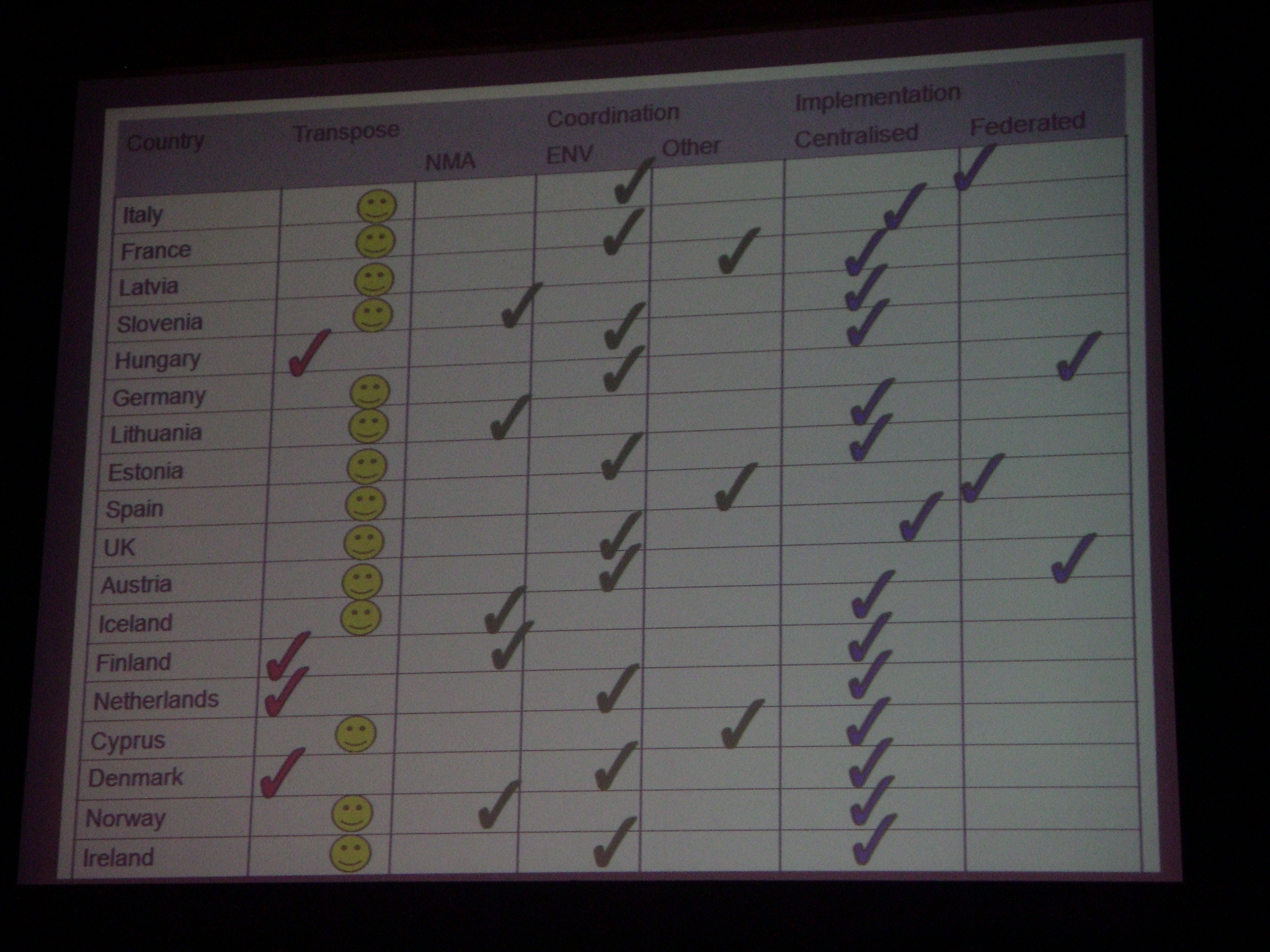 Etat de la mise en oeuvre d’INSPIRE : voir la photographie ci-dessous. NMA = l’IGN du pays en question est en charge, ENV = c’est le ministère de l’environnement, les autres colonnes expliquent l’organisation plus ou moins centralisée en fonction des institutions nationales. Ce dernier point n’engage que la Commission…
